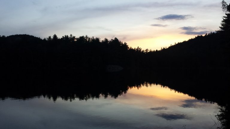 The trail looked so much different at night. We switched jobs near the top of the first hill—Bill put the stern of the canoe down, and held the middle of it up while I climbed under, resting the yoke on my shoulders. The trail was a muddy mess. I slipped and fell a few times, but managed to keep the canoe from hitting the ground. I saw a little drainage channel made of rocks that I didn’t remember seeing on the hike in. I had a feeling that we were walking the wrong way, but we didn’t see any other trails, so we kept going. The trail opened to a wider triangular shape, and our light stopped reflecting off the trees. We had found Putnam Pond.