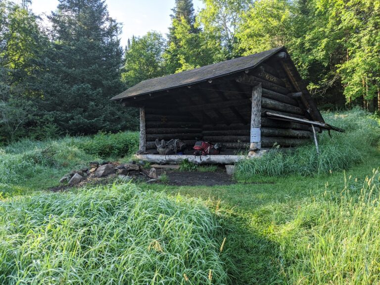 Our gear was strewn all over the floor of the lean-to, and we were sorting through our fishing stuff when four hikers approached from the opposite direction of where we came from. Three of them stayed down on the main trail, and one of them came to talk to us. She was a confident hiker that looked like she might be in her late 50s or early 60s. She had a brace on each knee, and used her hiking poles as she walked up the slope to the shelter. She told us, in a loud enough voice that her three companions could hear, that they would “let us have the lean-to” and were planning to camp in the next site further down the trail. She informed us that they might come back to the shelter later that night if the storm coming through in the evening was bad.